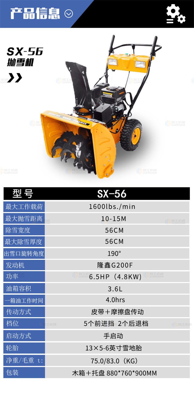 XG-56小型手扶自走清雪機掃雪機(黃色)