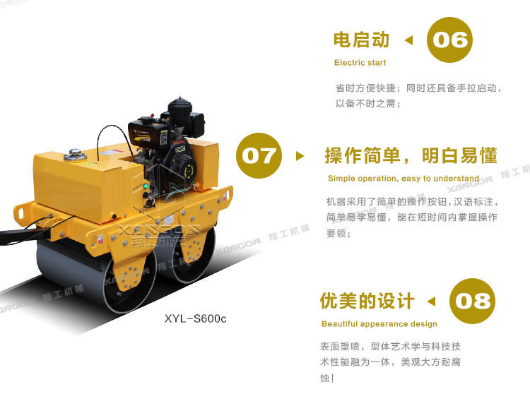 ·柴油動(dòng)力采用電啟動(dòng),輕便靈活換向機(jī)構(gòu);雙驅(qū)雙振,保證了整體的壓實(shí)和爬坡能力;
