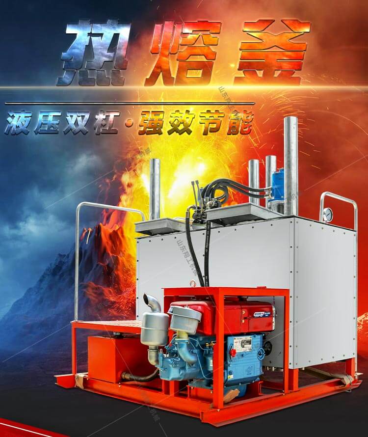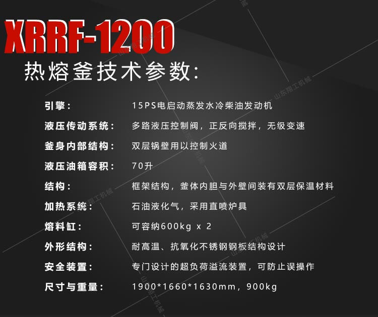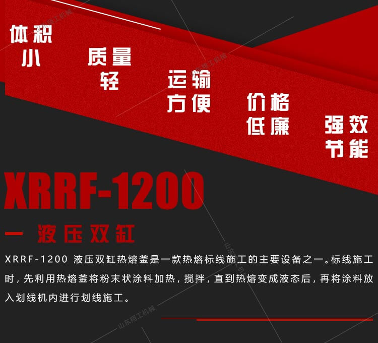 XG1200液壓雙缸熱熔釜是一款熱熔標(biāo)線施工的主要設(shè)備之一。標(biāo)線施工時(shí),先利用熱熔釜將粉末狀涂料加熱,攪拌,直到熱熔變成液態(tài)后,再將涂料放入劃線機(jī)內(nèi)進(jìn)行劃線施工。由于涂料的融化質(zhì)量直接關(guān)系到標(biāo)線質(zhì)量,因此熱熔釜是熱熔標(biāo)線設(shè)備的關(guān)鍵部件,是涂料的融化必不可少的部分。