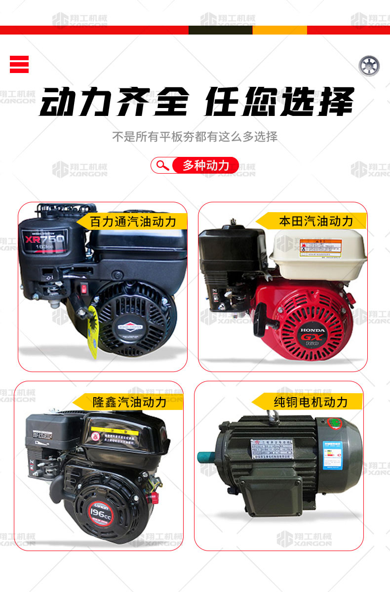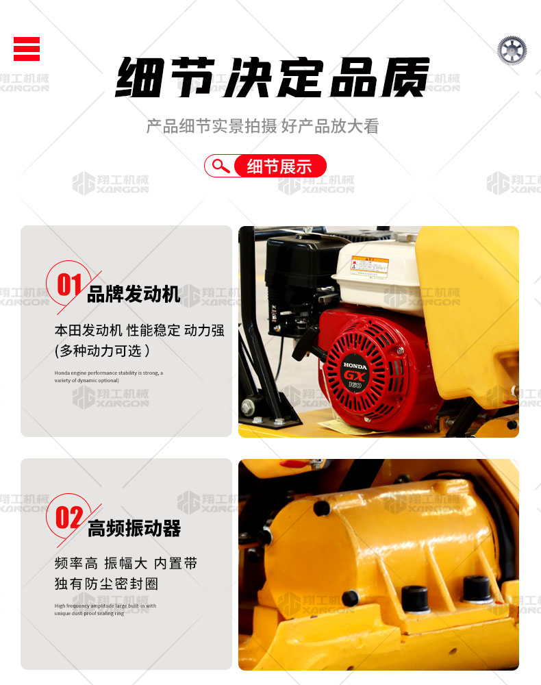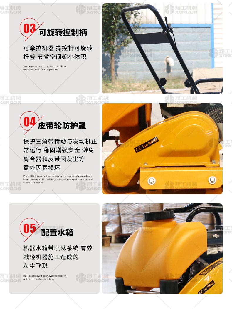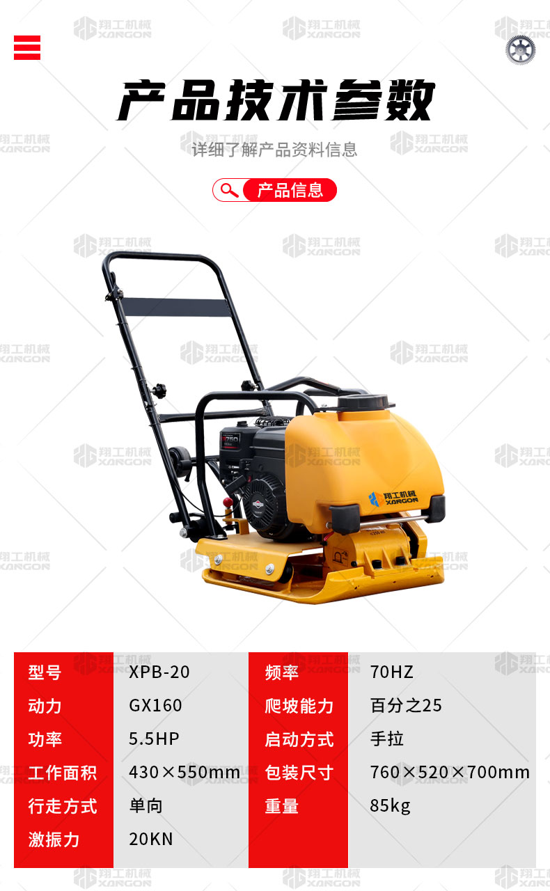 單向平板夯XPB-20適用于路基邊緣、橋涵、管道、溝槽底部等狹長地帶的壓實。 HONDA動力,性能優(yōu)越,啟動容易 采用單獨懸掛式強力減震機構(gòu),減少對發(fā)動機的沖擊,提高操作人員的舒服感;
