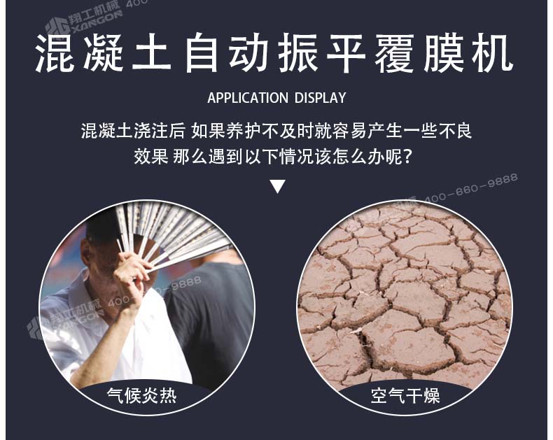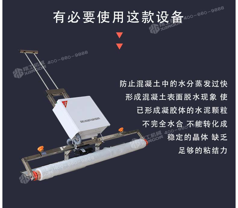 混凝土澆注后,如果養(yǎng)護不及時就容易產(chǎn)生一些不良效果,如氣候炎熱、空氣干燥等情況,我們就有必要使用這款設備,防止混凝土中的水分蒸發(fā)過快,形成混凝土表面脫水現(xiàn)象,使已形成凝膠體的水泥顆粒不完全水合,不能轉化成穩(wěn)定的晶體,缺乏足夠的粘結力。因此,混凝土表面會出現(xiàn)剝落或粉粒脫落。另外,當混凝土強度不夠時,過早蒸發(fā)水分會產(chǎn)生較大的收縮變形和干縮裂縫。因此,混凝土澆筑后的初期養(yǎng)護非常重要,終凝后應立即進行養(yǎng)護。