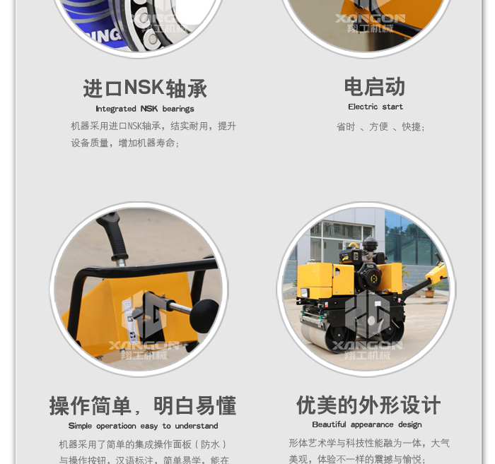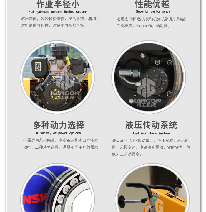 4.發(fā)動(dòng)機(jī)電啟動(dòng),機(jī)器振動(dòng)電磁離合控制,操作更加輕松方便;