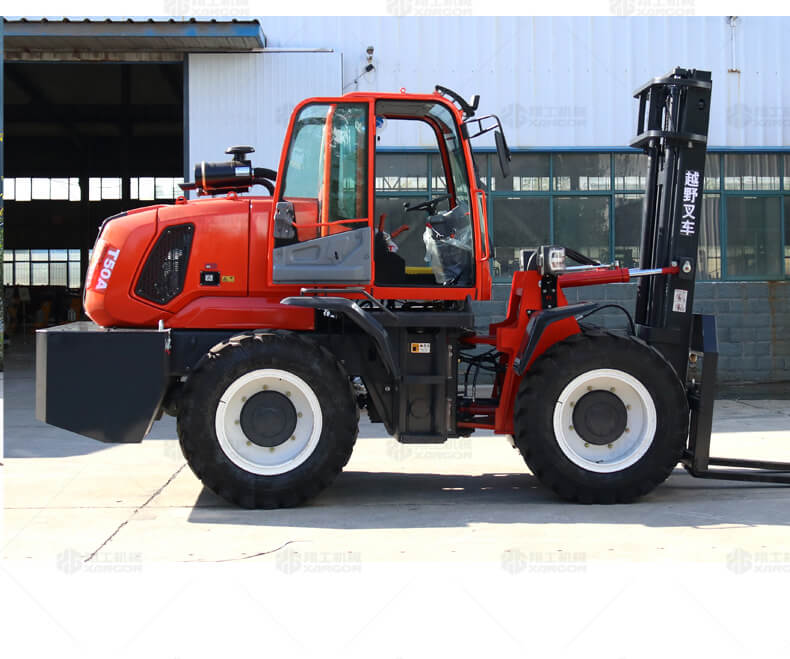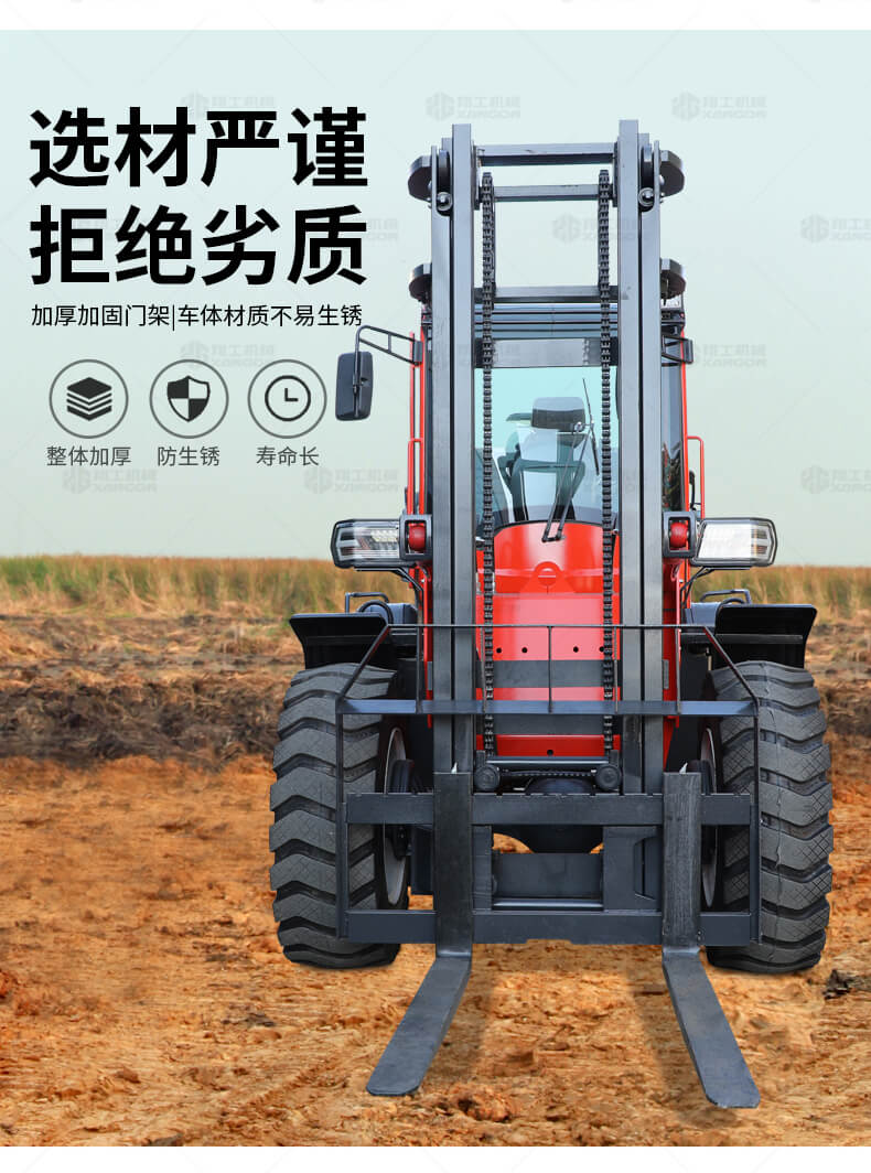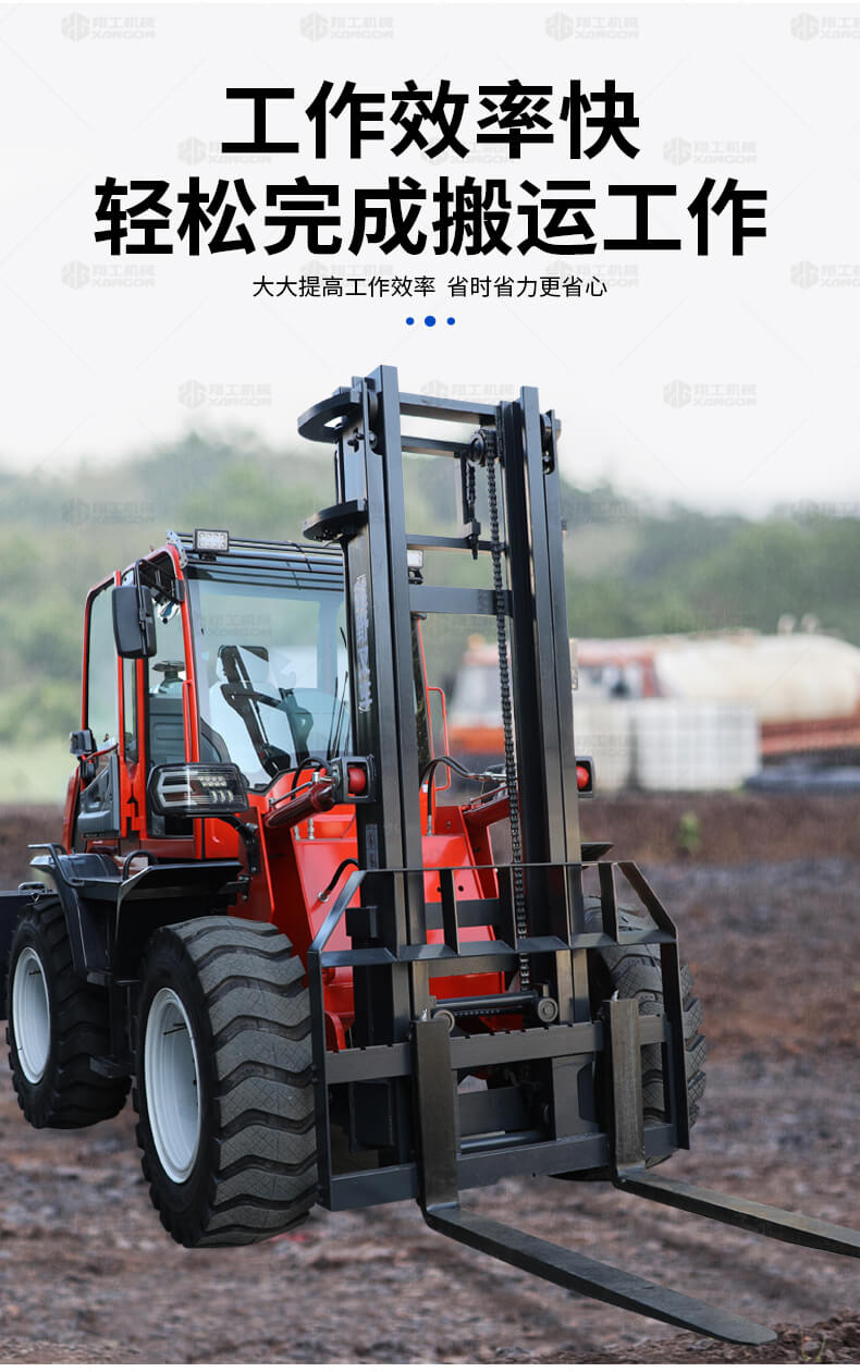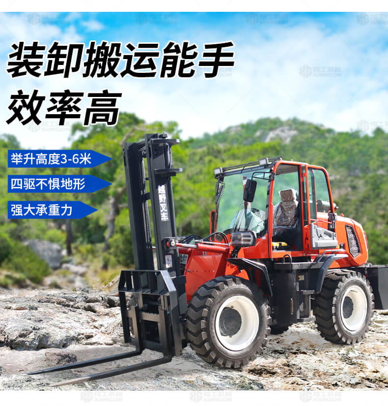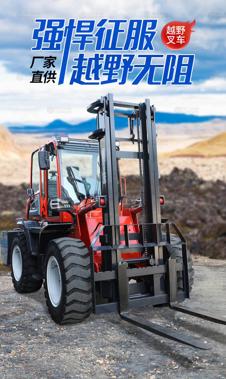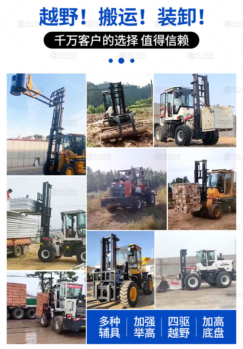 越野叉車可以在坡地和不平地面上進(jìn)行貨物裝、卸、堆垛及搬運(yùn)作業(yè),具有良好的機(jī)動(dòng)性、越野性可靠性。其功能多樣,可搭配側(cè)移器、調(diào)距叉、旋轉(zhuǎn)器、軟包夾、推出器、側(cè)翻叉、側(cè)翻斗、起重臂等工具完成不同的工作。