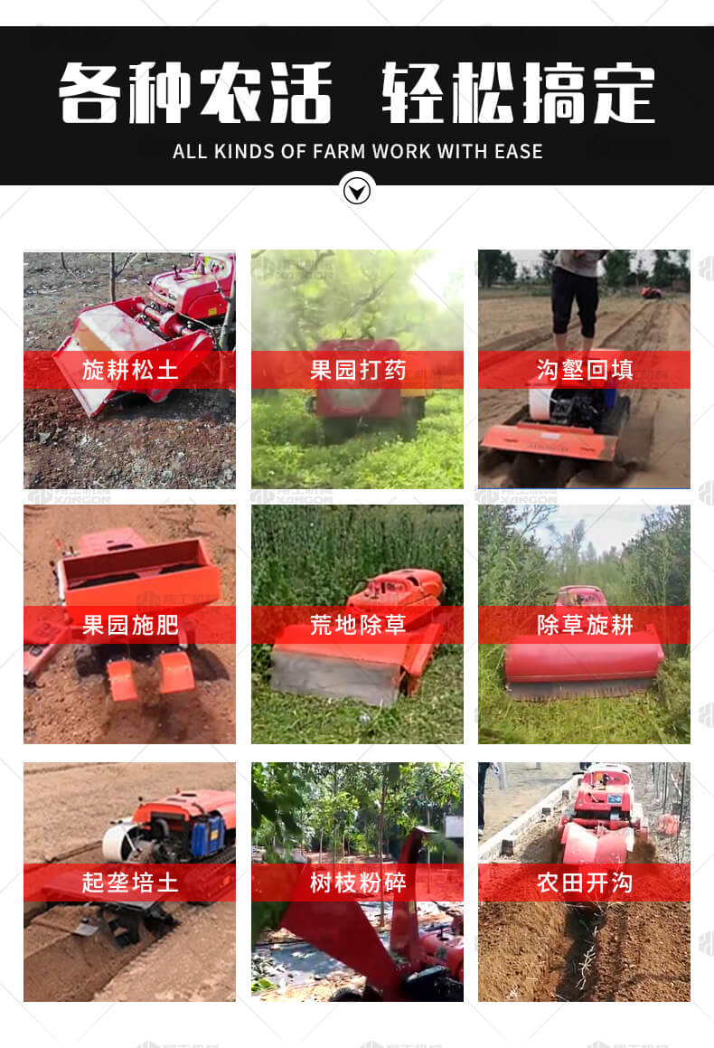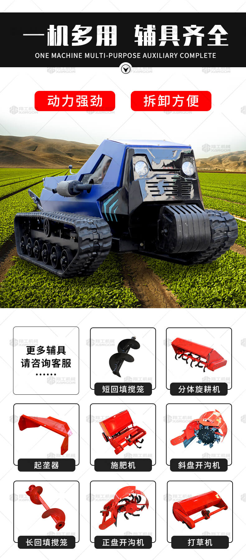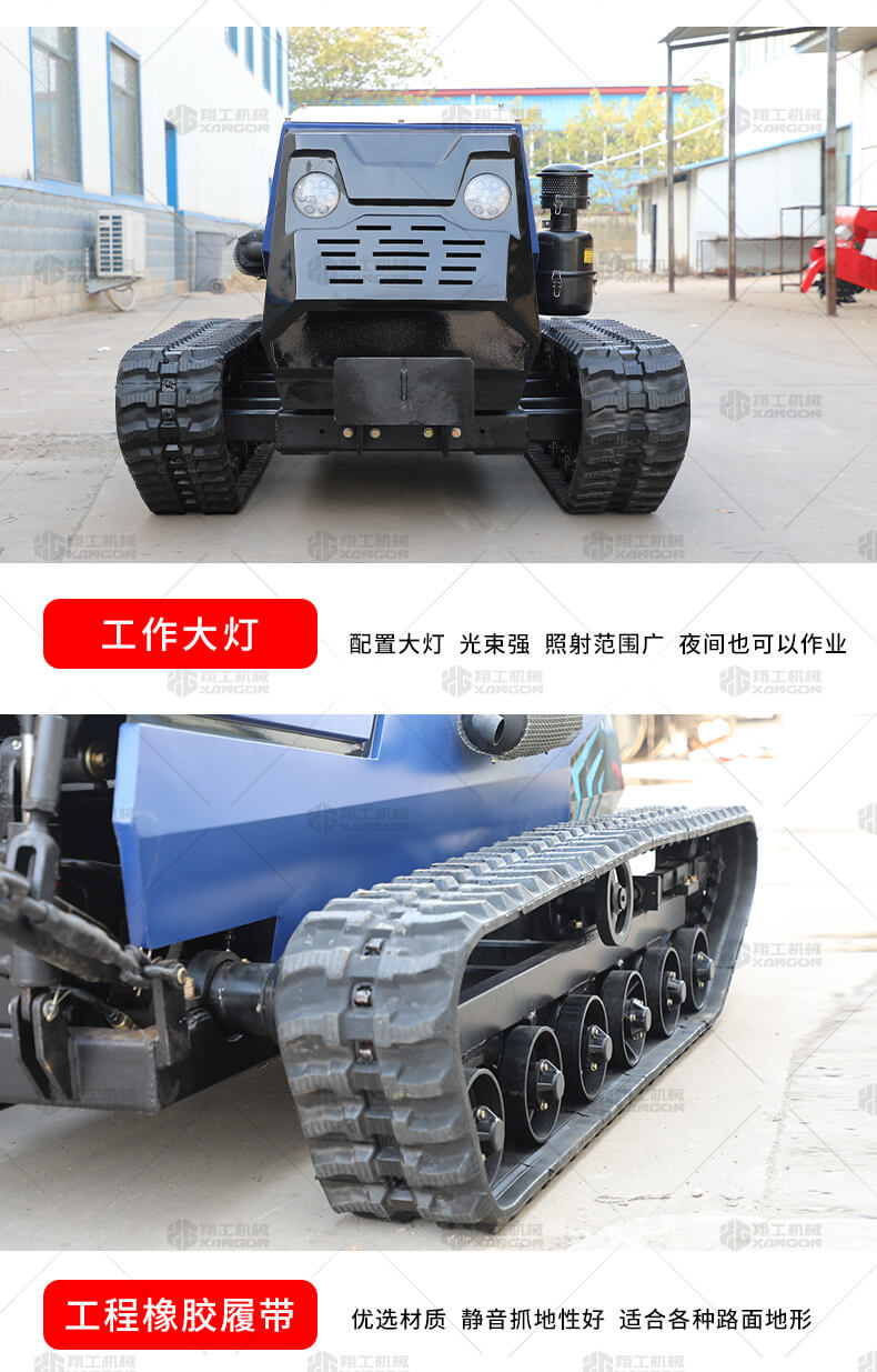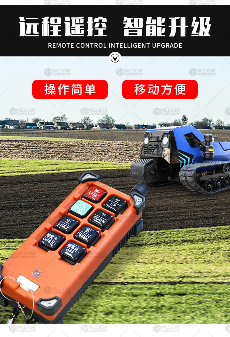 本產(chǎn)品采用履帶式驅(qū)動設(shè)計,穩(wěn)定性和爬坡能力較強,適應(yīng)丘陵山地平原各種地形,機型小功率大,適應(yīng)各種行距的果樹,大棚,園林。產(chǎn)品動力強勁,結(jié)實耐用,性能優(yōu)越,安全放心,遠程操控,省心省力。